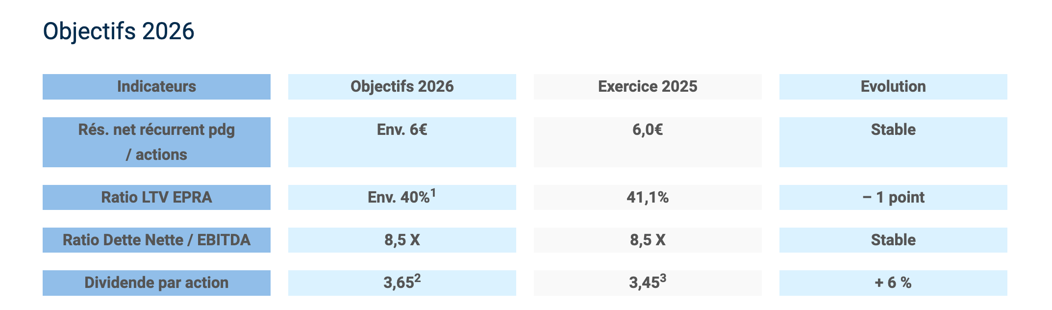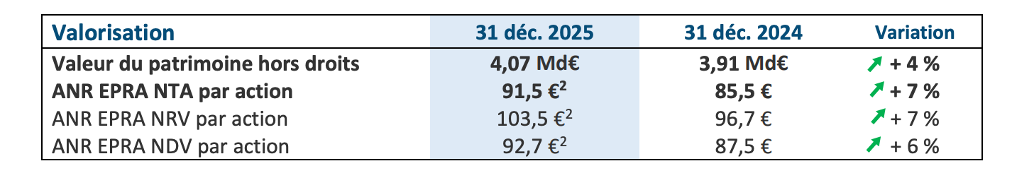 LTV (EPRA) : 41,1% fin 2025, en baisse de 200 bps vs 2024. En ligne avec la moyenne sectorielle.