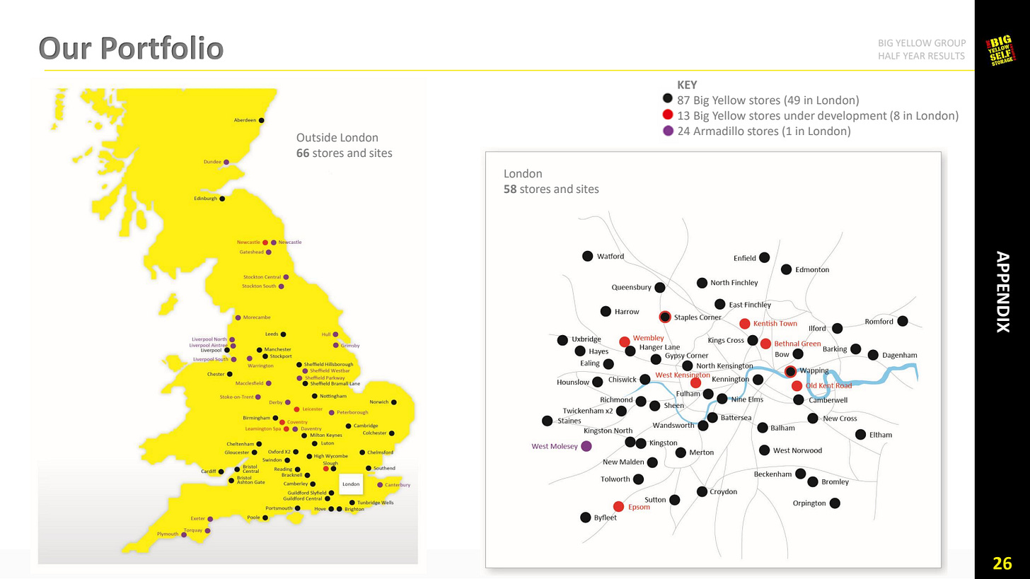 Big Yellow Group, c’est 111 centres de self-storage répartis à travers le Royaume-Uni, avec une concentration massive sur Londres et sa couronne (75% des revenus).