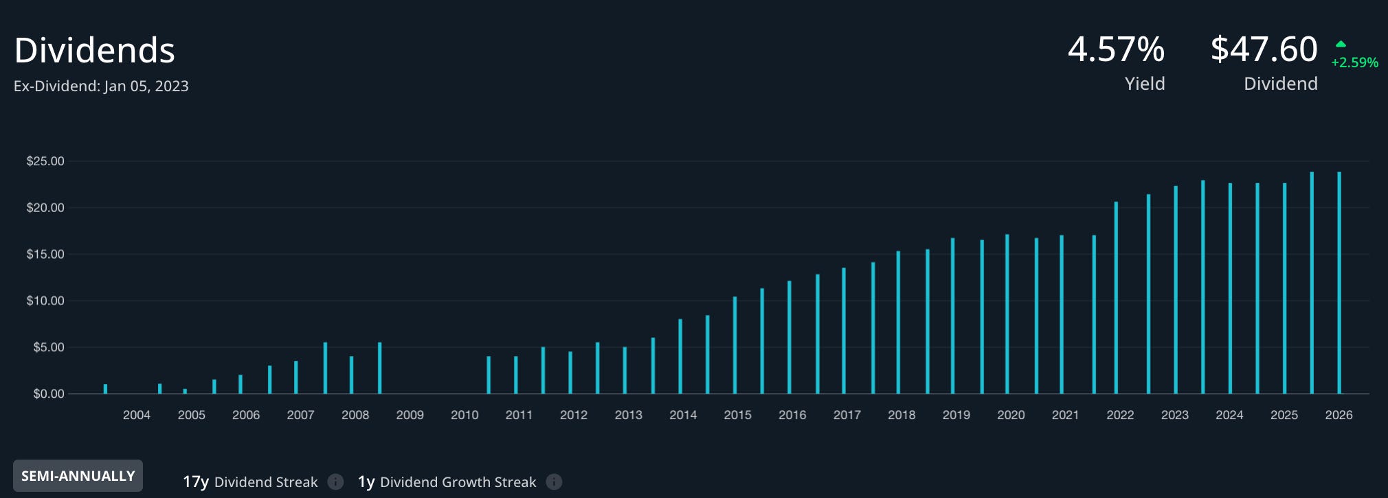 La croissance du dividende devrait se poursuivre au rythme de 4 à 5% par an, en ligne avec la progression des bénéfices. L’acompte sur dividende annoncé pour janvier 2026 s’établit à 23,8 pence, en hausse de 5% sur un an.