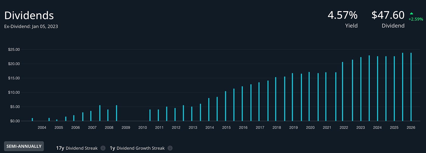 Le dividende actuel de 47,6 pence par action représente un rendement d’environ 4,5% au cours actuel. Ce niveau dépasse significativement la moyenne historique du titre (3,7% sur cinq ans), suggérant que la valorisation actuelle offre un point d’entrée attractif.