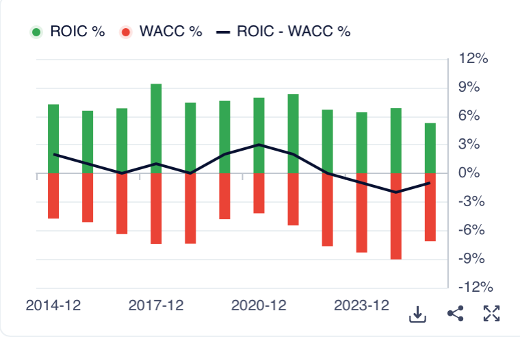 ROIC (Return on Invested Capital) : 5.27% (vs WACC de 7.15%)