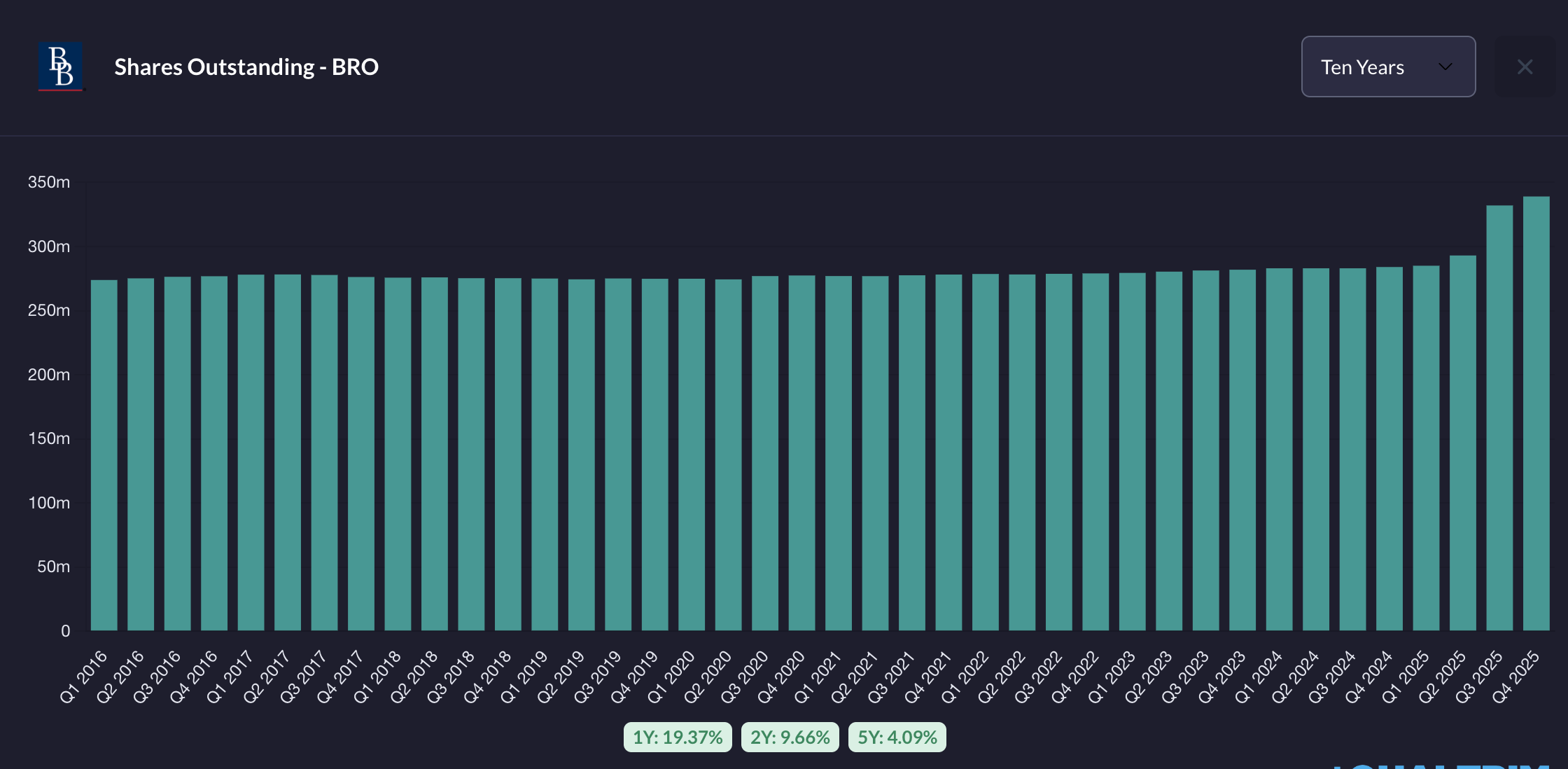 Qu’est-ce que ça signifie ? Si Brown & Brown devait déprécier ne serait-ce que 50% de son goodwill (ce qui arriverait si la moitié des acquisitions passées s’avéraient être des échecs), les capitaux propres seraient quasi anéantis.