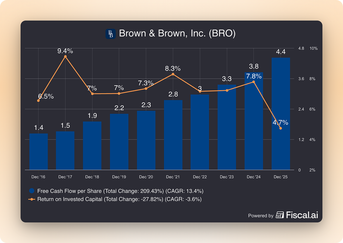 Le ROIC actuel de Brown & Brown est de 4.7%, calculé sur la base des données 2025.