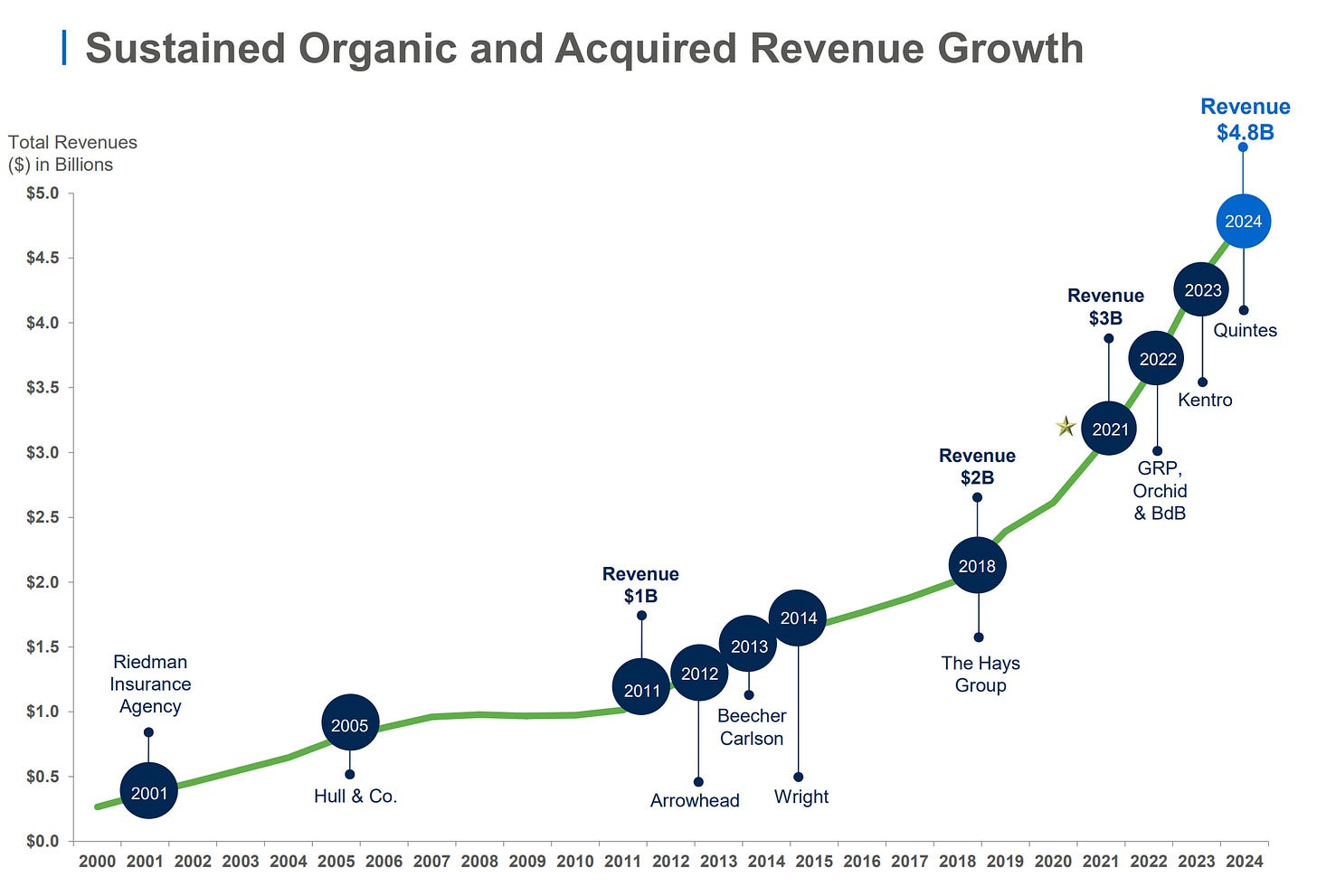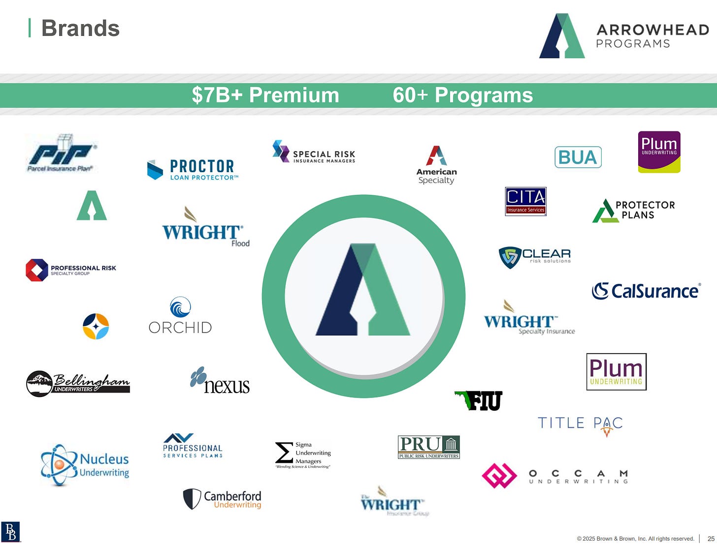 De 1993 à 2024, Brown & Brown a réalisé plus de 600 acquisitions, essentiellement des petites agences de courtage payées 5-7x EBITDA.