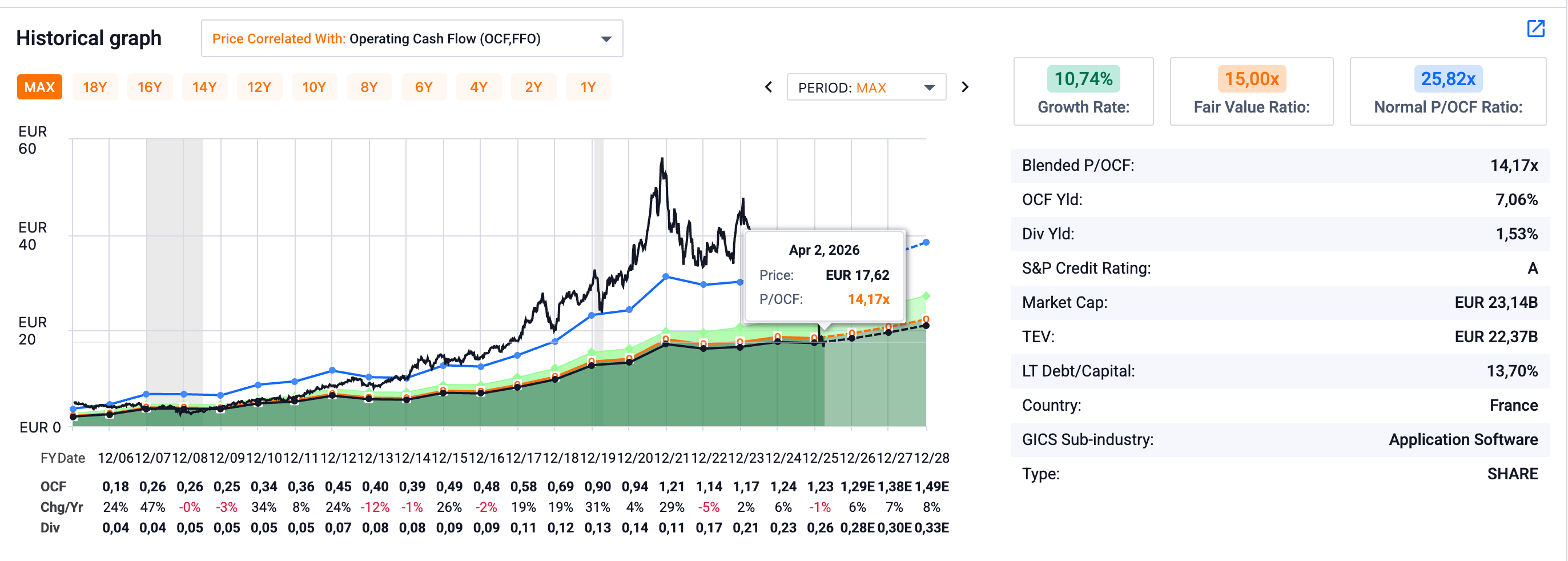 Le marché valorise Dassault Systèmes à un Price-to-FCF d’environ 16-17x, contre une médiane historique sur 10 ans d’environ 35-45x (source : GuruFocus) et 25,82x selon Fastgraph