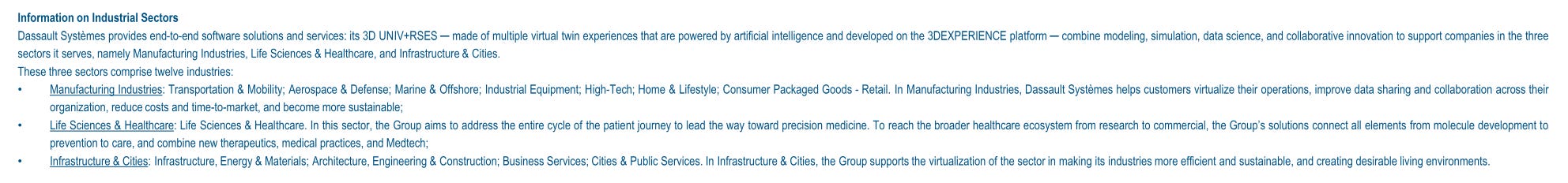 Industrial Innovation (56% des revenus software) regroupe CATIA (le standard de la conception 3D aérospatiale et automobile), SIMULIA (simulation multi-physique), ENOVIA (PLM — Product Lifecycle Management, c’est-à-dire la gestion de toute la vie d’un produit, de sa conception à sa mise au rebut), DELMIA (fabrication numérique) et GEOVIA (géologie).