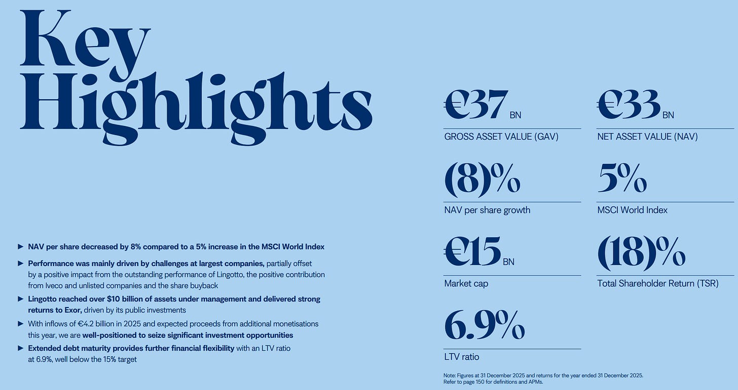 L’exercice 2025 est objectivement médiocre pour Exor. Les chiffres clés parlent d’eux-mêmes :