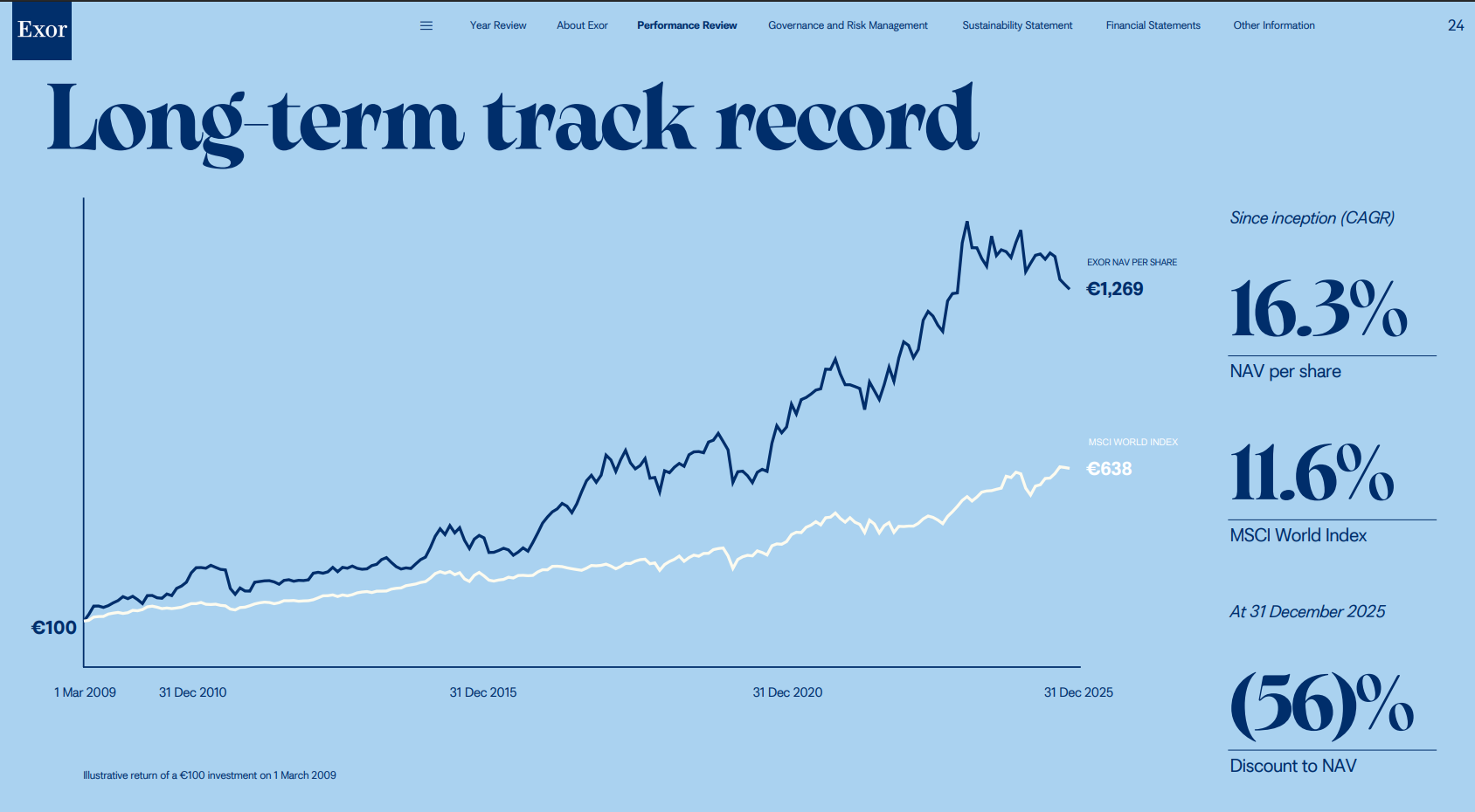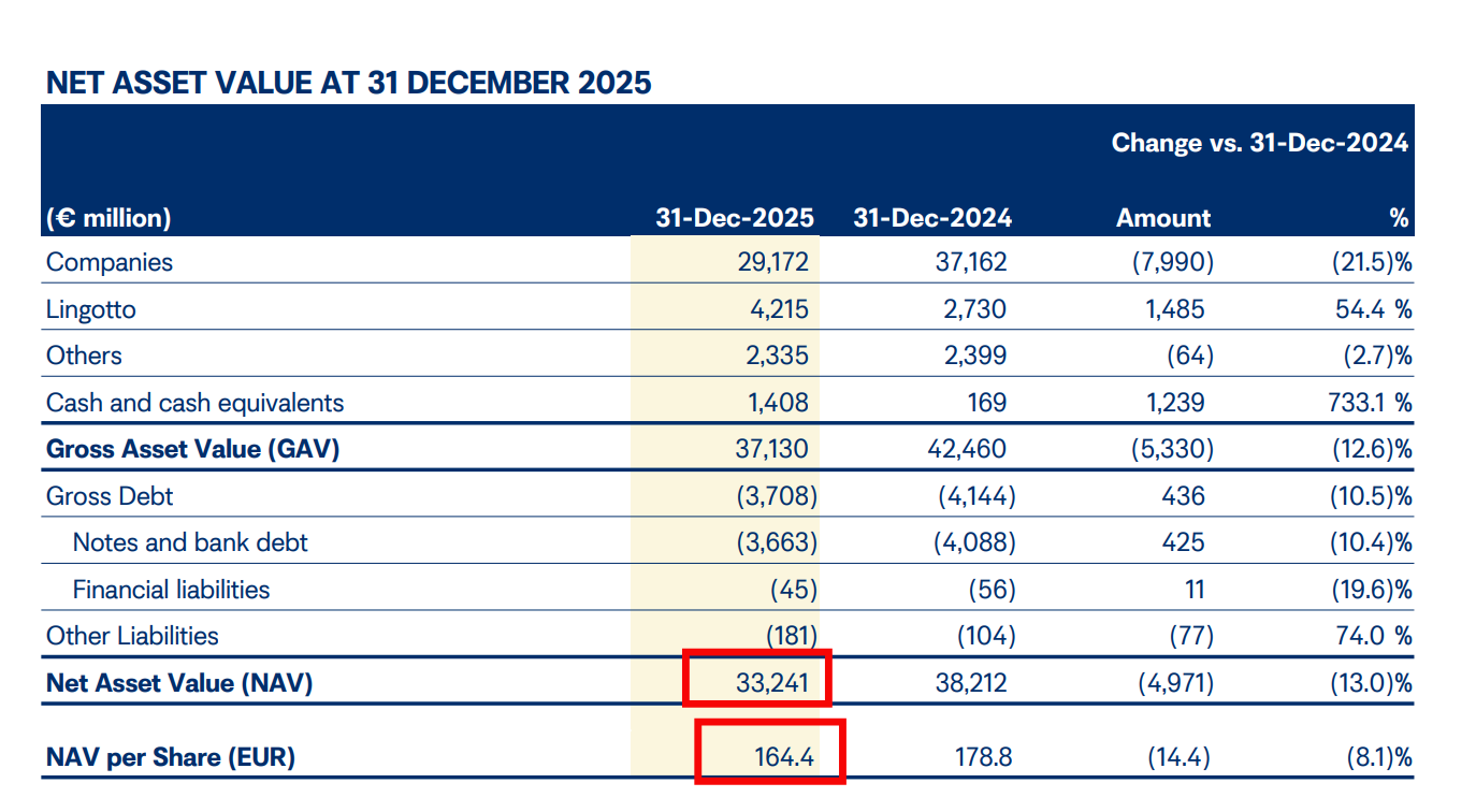 La NAV (Net Asset Value) totale : €33,241 milliards. C’est la valeur théorique de l’ensemble des actifs d’Exor, nette de ses dettes. Rapportée au nombre d’actions, cela donne une NAV par action de €164,4.
