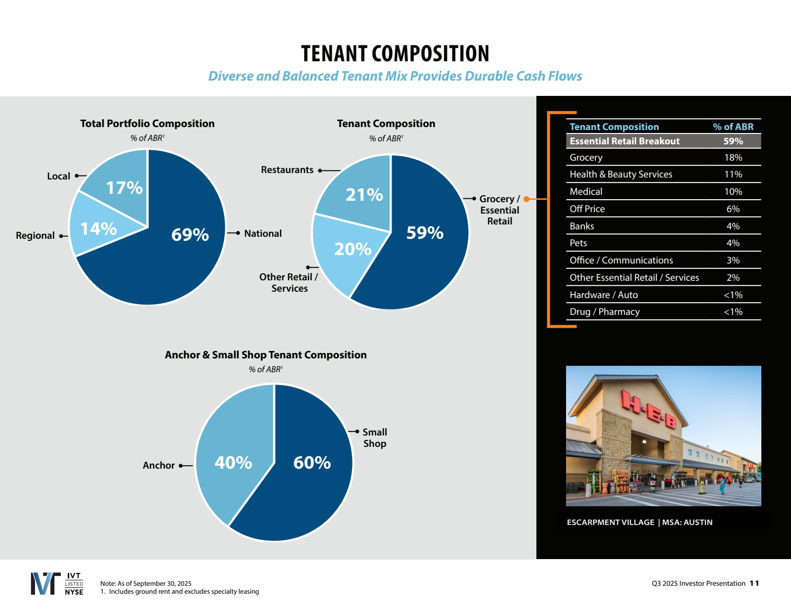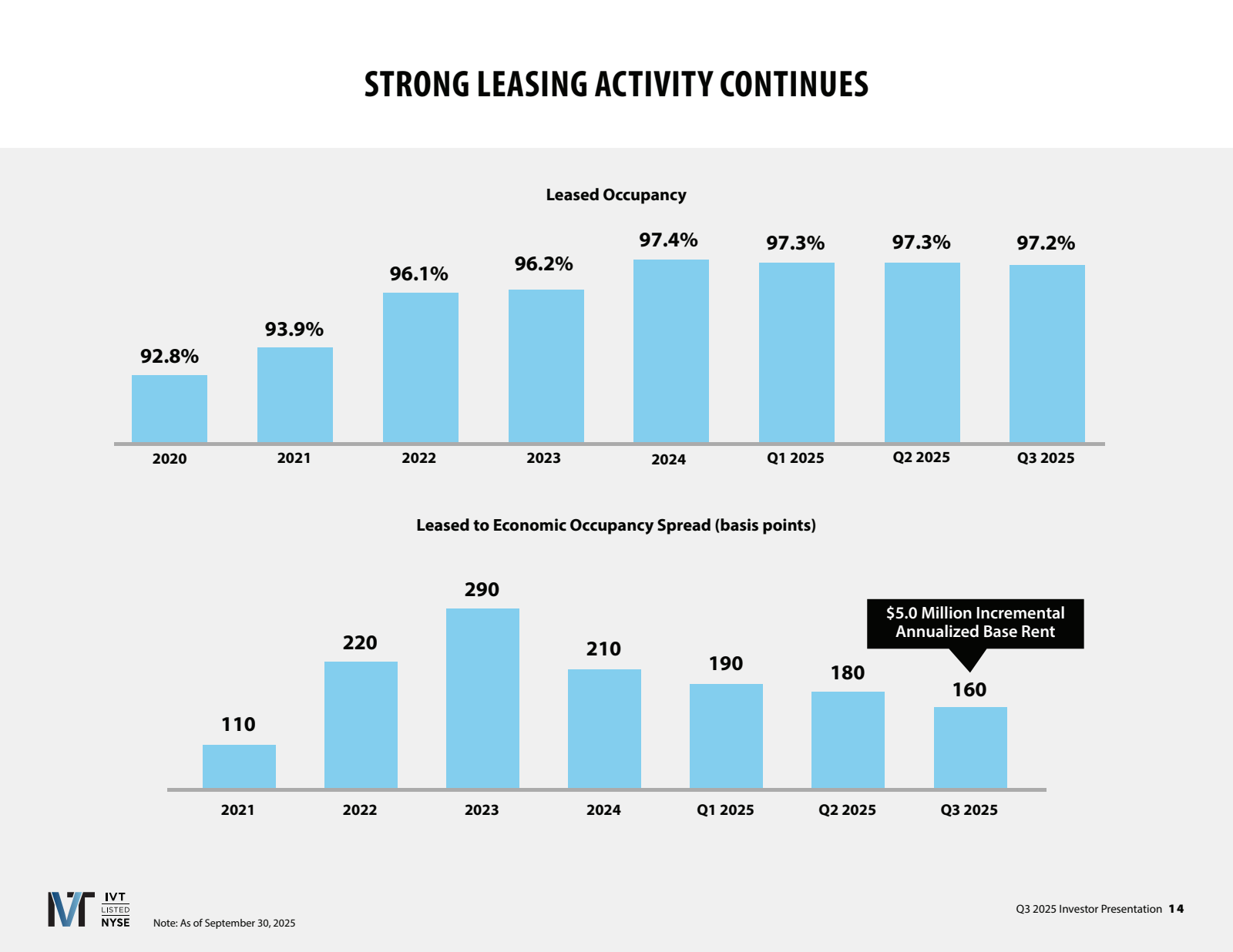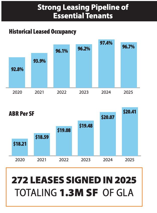 “The strength is evident in our leasing results, with several key metrics reaching their highest level since our listing in 2021. New leases executed in 2025 achieved a 30.9% spread, while renewals averaged 10.9%, resulting in blended comparable leasing spreads of 13.3%. Small shop lease occupancy also reached a new all-time high of 94%.”