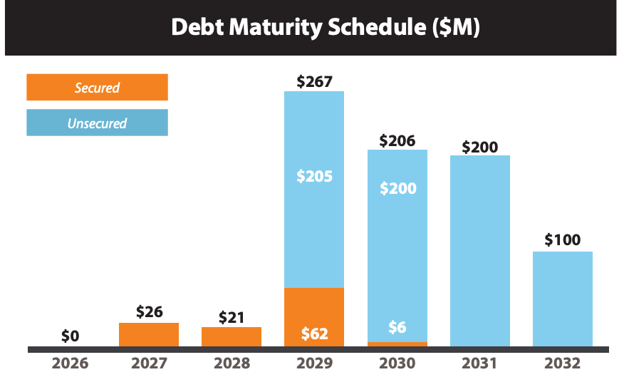 Aucune dette ne doit être refinancée en 2026. Seulement 26 millions arrivent à maturité en 2027. L’extension proactive des term loans jusqu’en 2030-2031 a été réalisée en août 2025.