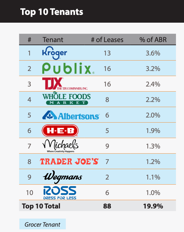 Le portefeuille est ancré par des enseignes alimentaires de premier plan. Kroger représente 3,6% de l’ABR avec 13 baux, Publix 3,2% avec 16 baux, TJX Companies 2,4% avec 16 baux, Amazon via Whole Foods 2,2% avec 8 baux, Albertsons 2,0% avec 6 baux, et H.E.B. 1,9% avec 5 baux. Le Top 10 des locataires représente au total 19,9% de l’ABR réparti sur 88 baux.