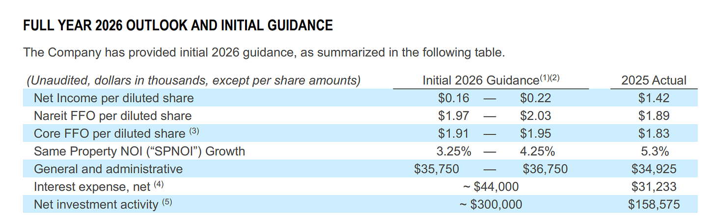 La croissance du Same-store NOI est attendue entre 3,25% et 4,25%, plus conservatrice que les 5,3% réalisés en 2025.