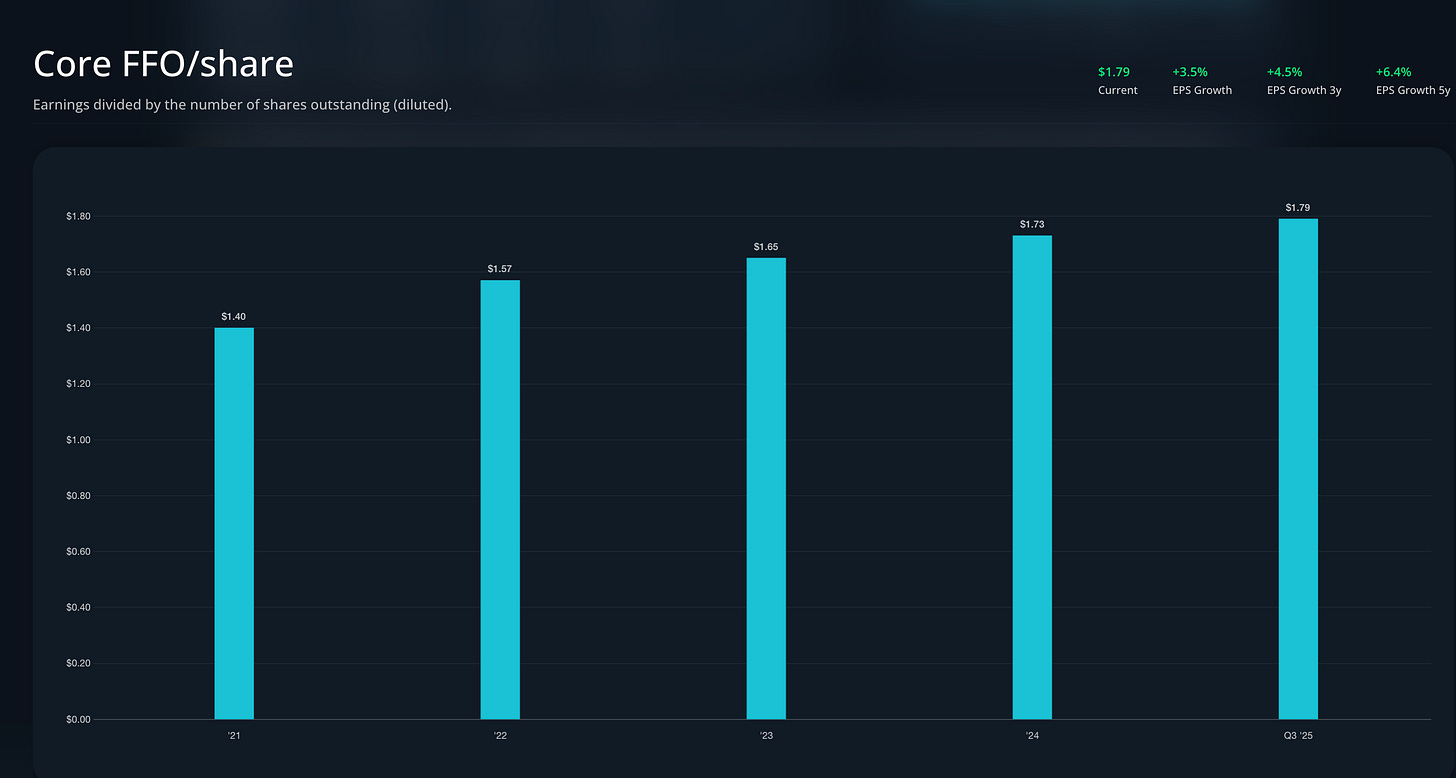 Point positif : La guidance est précise et régulièrement atteinte. En 2025, le Core FFO est sorti au haut de la guidance à 1,83 $ par action. Comme l’a confirmé DJ Busch : “Core FFO finished the year at the high end of our guidance range of $1.89 per share, representing 6.2% growth year over year.”