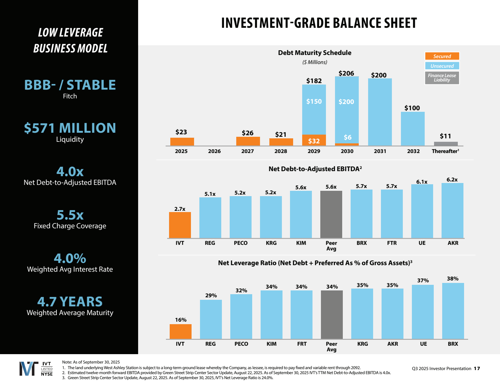 Mon analyse : Le bilan est une forteresse. Avec 4,5x de Net Debt/EBITDA et 480 millions de liquidité, IVT a une flexibilité considérable pour saisir des opportunités ou traverser un retournement de marché. C’est l’un des bilans les plus solides du secteur retail REIT.