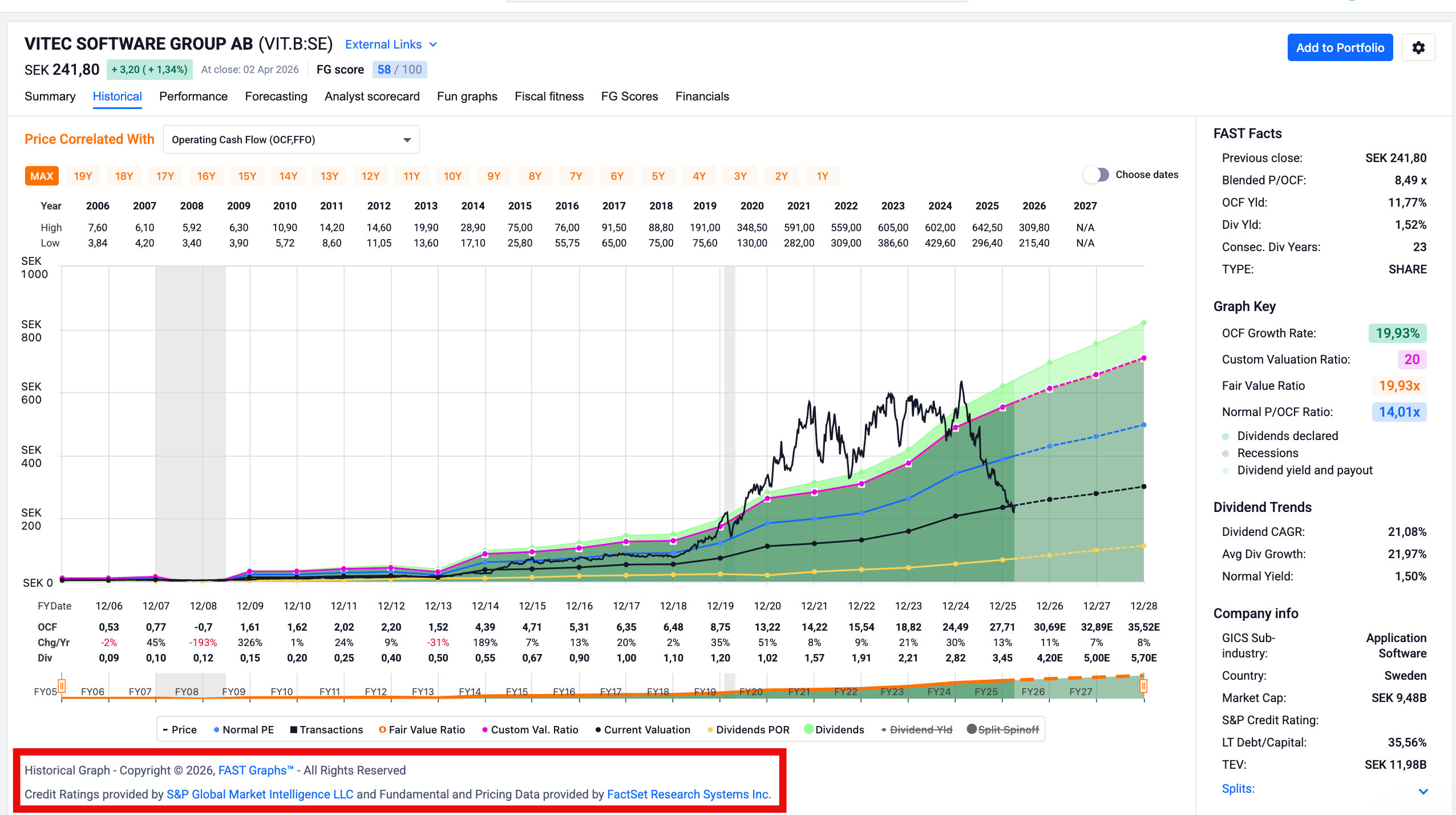 Le gros avantage de FAST Graphs par rapport à beaucoup d’autres logiciels du marché, c’est la source des données. Là où la plupart des plateformes se contentent de répliquer les données de Yahoo Finance, FAST Graphs s’appuie sur les données de Standard & Poor’s. En termes de fiabilité et de profondeur, ce n’est tout simplement pas comparable. Quand vous construisez une valorisation ou que vous analysez l’historique d’un titre, vous travaillez avec des données auxquelles vous pouvez faire confiance.