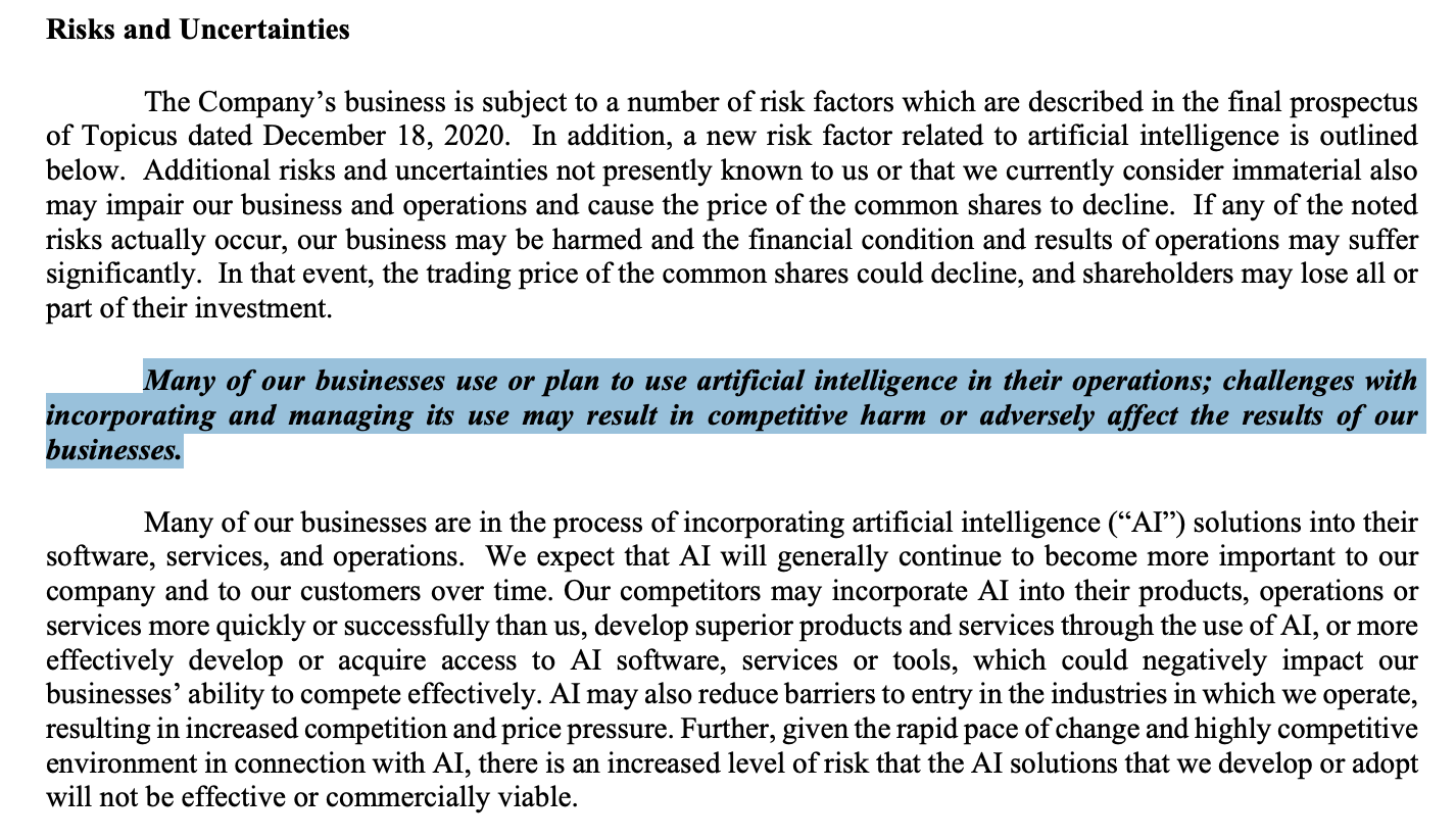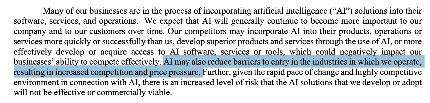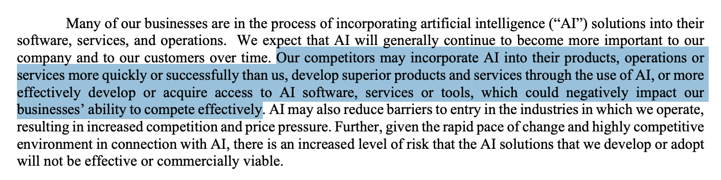 Le management écrit : “Our competitors may incorporate AI into their products, operations or services more quickly or successfully than us, develop superior products and services through the use of AI, or more effectively develop or acquire access to AI software, services or tools, which could negatively impact our businesses’ ability to compete effectively.”