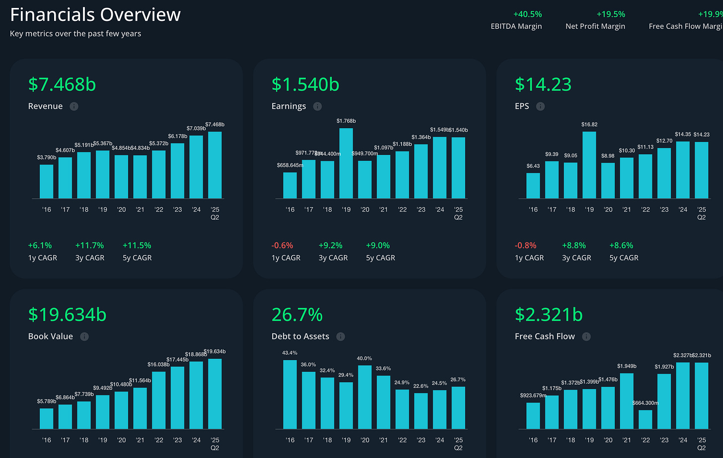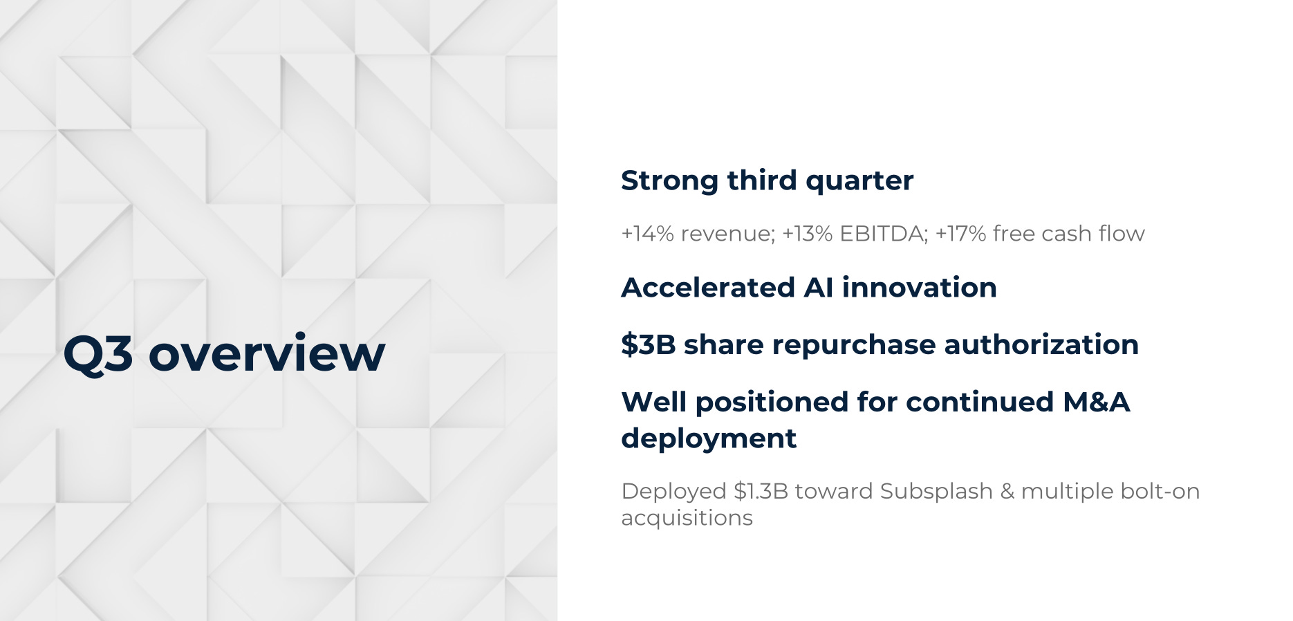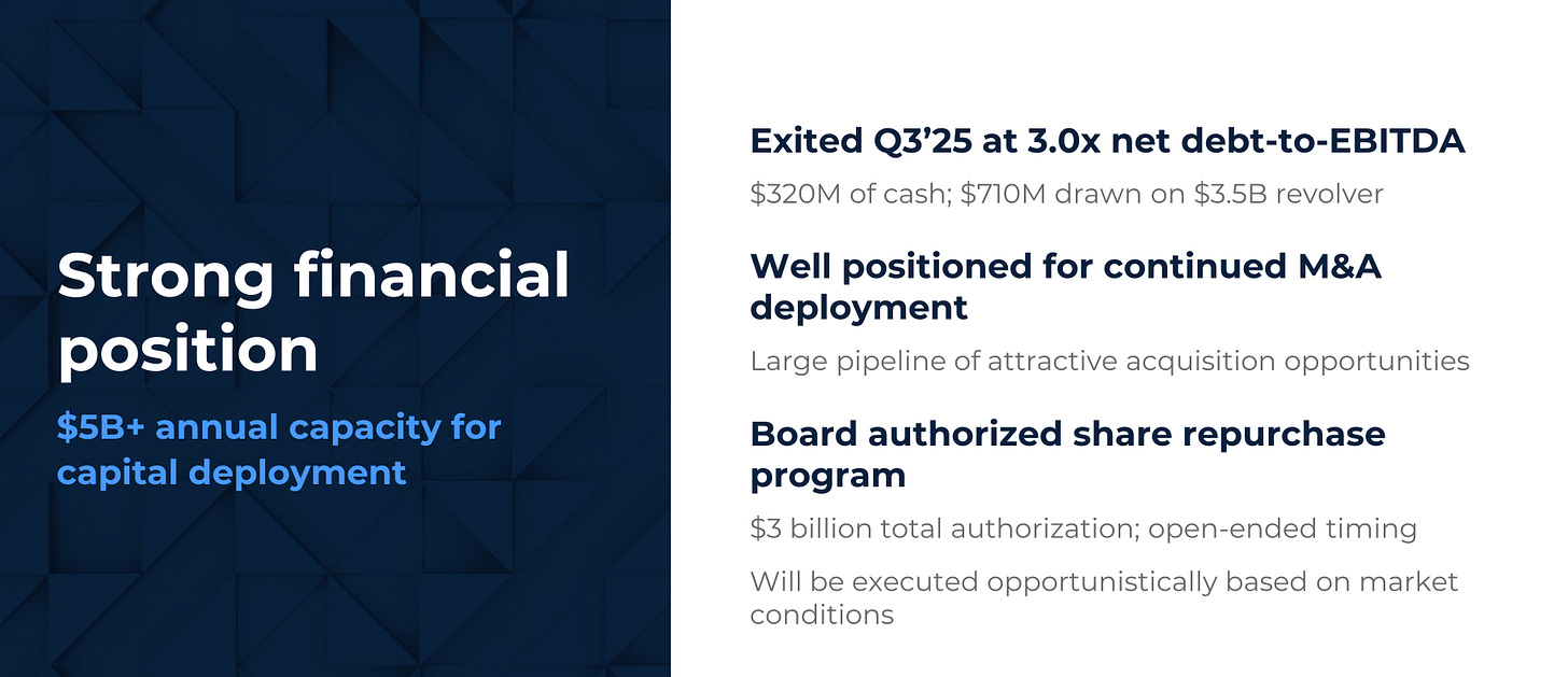 The company continues to execute its disciplined capital deployment strategy, investing $1.3 billion in acquisitions and launching a $3 billion buyback program.