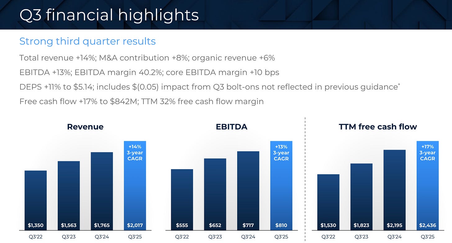 Roper Technologies achieved an excellent Q3 2025, with 14% revenue growth and a 17% increase in free cash flow.