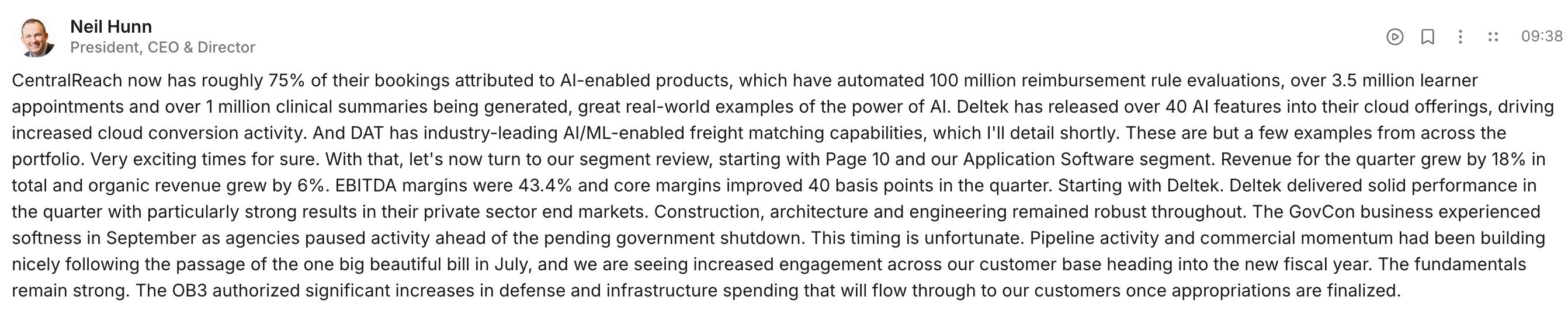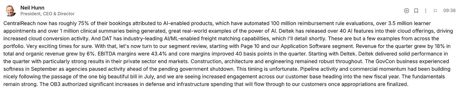 Deltek (GovCon): Slower government-related activity due to political uncertainty and potential budget shutdowns.