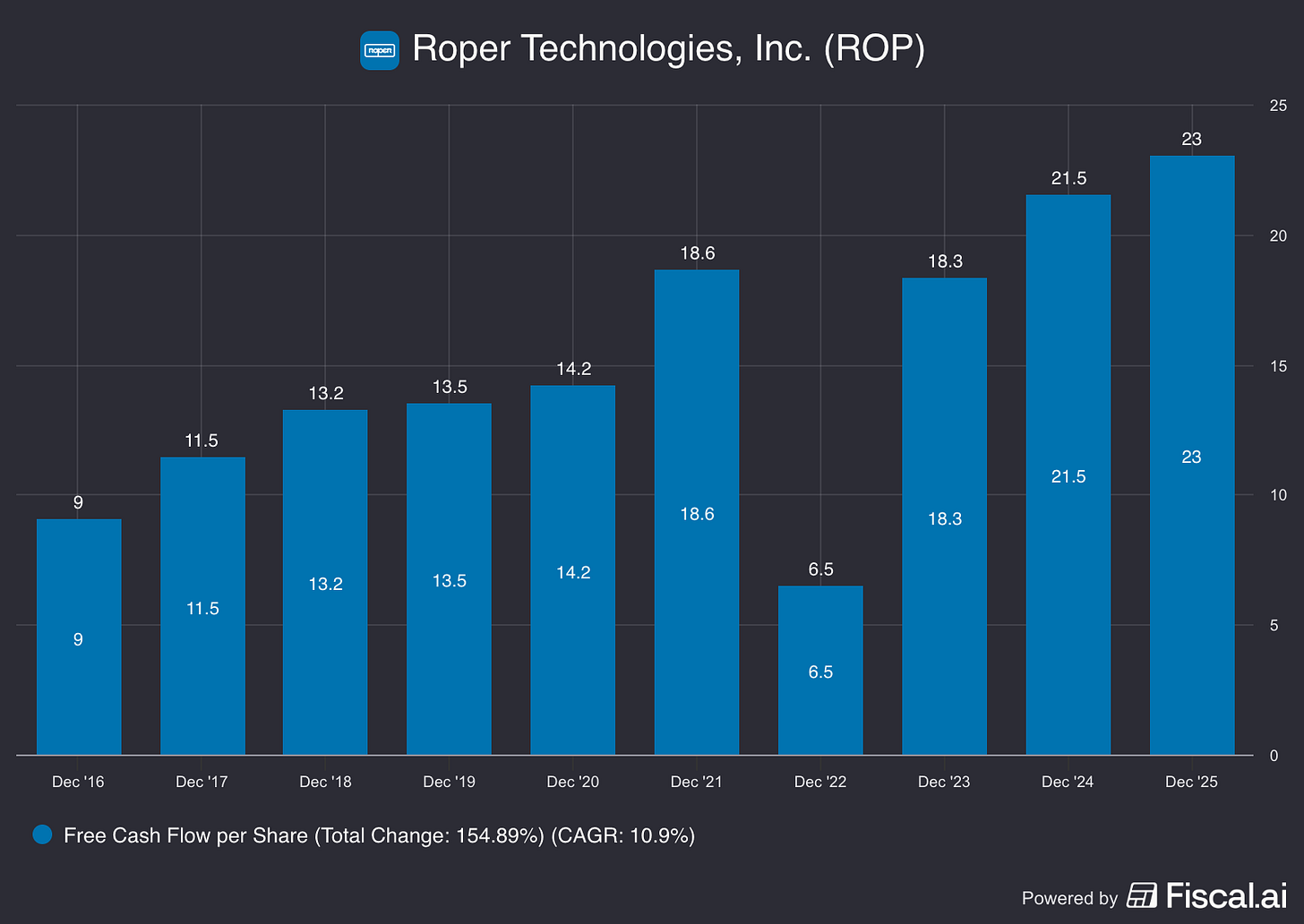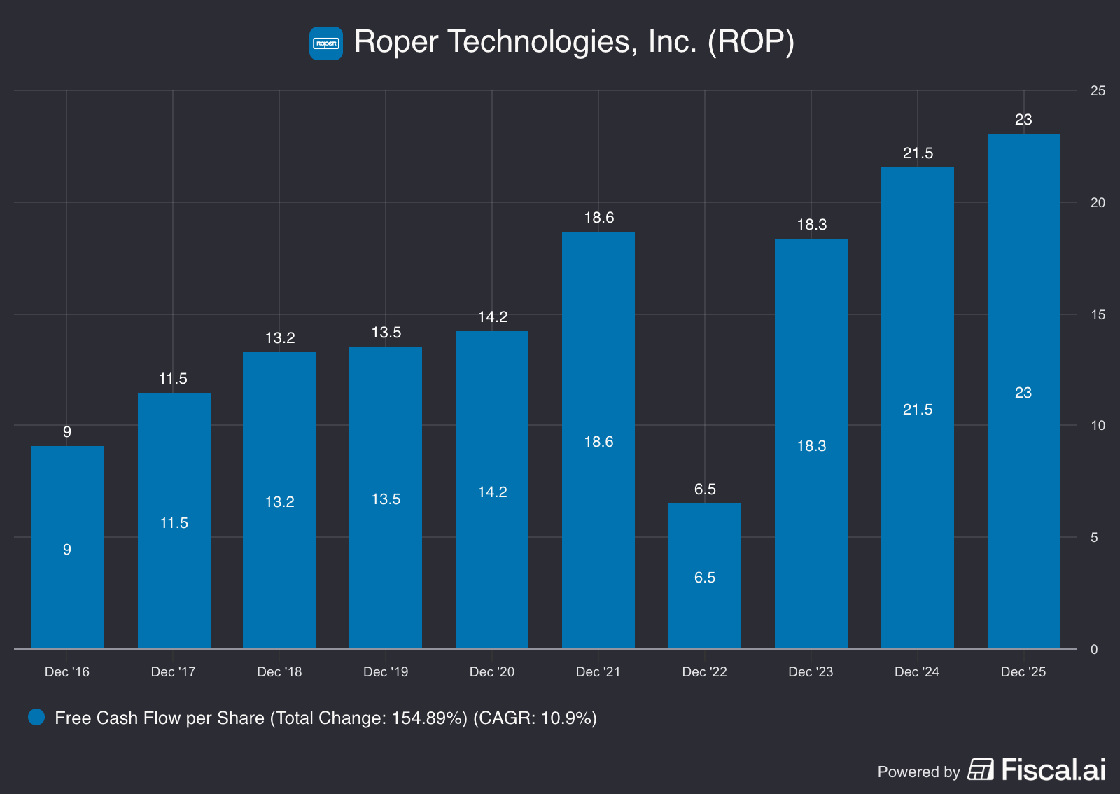 En 2025, Roper a généré 2,47 milliards de dollars de FCF ajusté, en hausse de 8% par rapport à 2024.