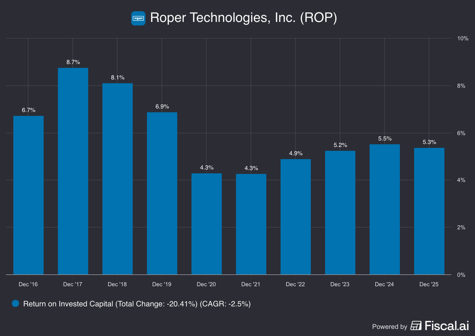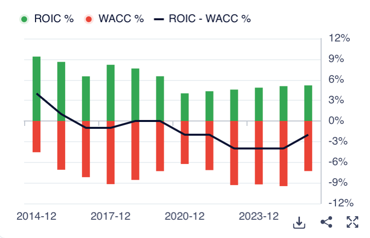 Les chiffres de Roper sont alarmants. Selon GuruFocus, le ROIC de Roper est de 5,2% (TTM) contre un WACC (coût moyen pondéré du capital) de 7,2%.