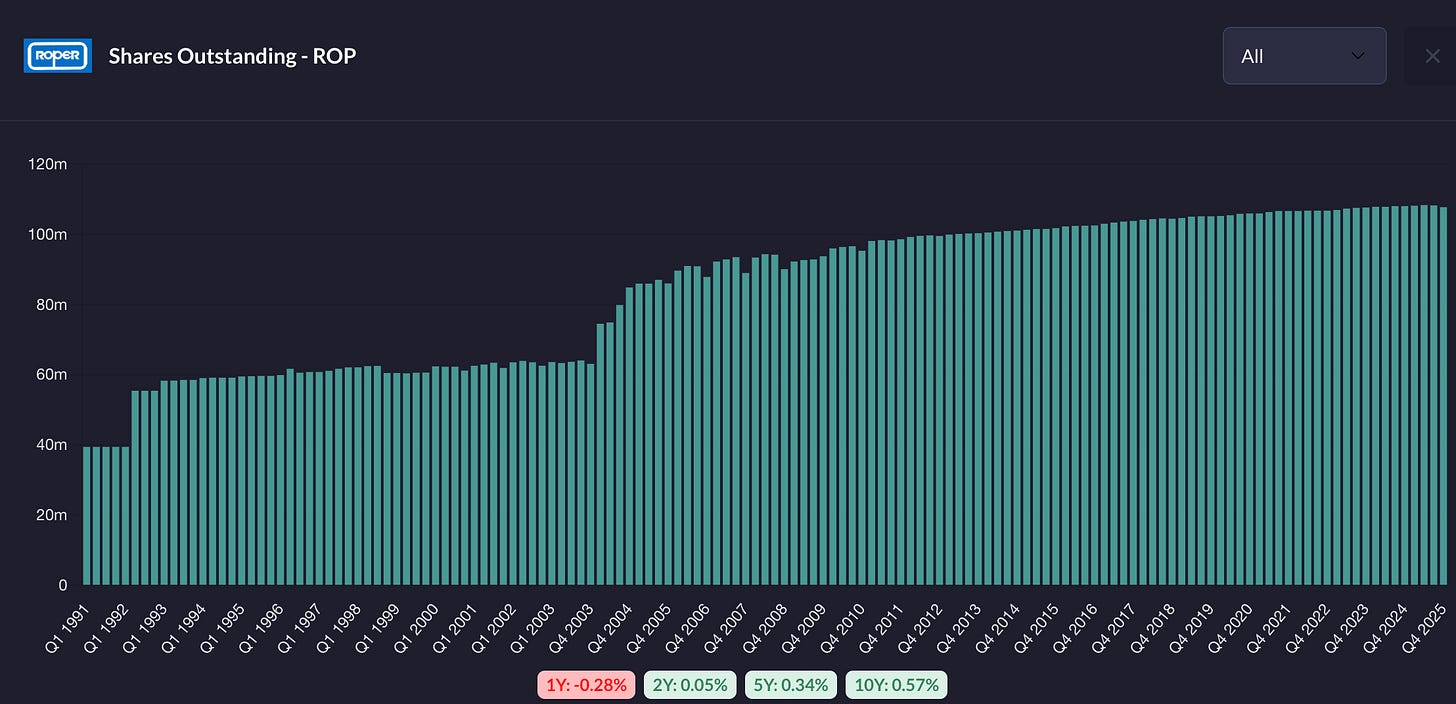 Point positif majeur : Roper a été remarquablement discipliné sur la dilution. Le nombre d’actions est passé de 100 millions en 2012 à 108 millions fin 2025, soit une augmentation de seulement 8% en 13 ans, ou moins de 0,6% par an. C’est excellent pour un serial acquirer.