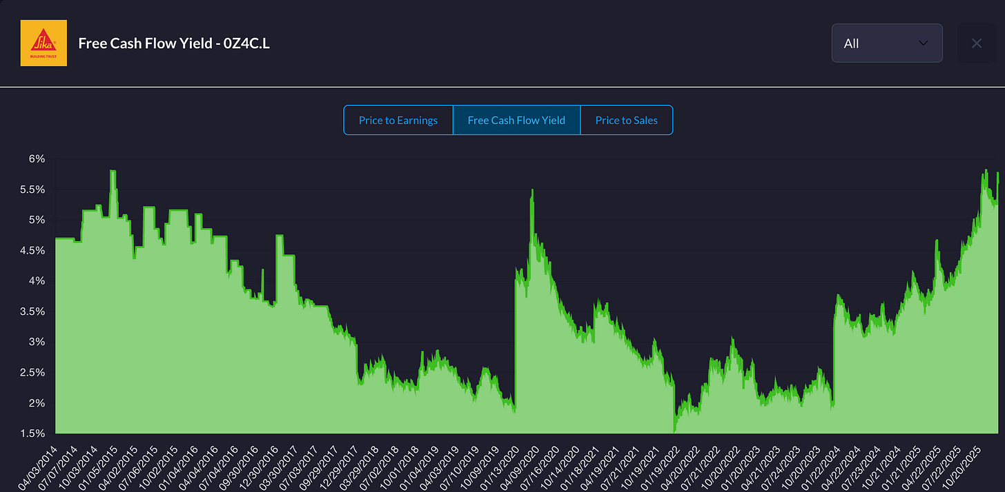 Observation clé : Sika se traite aujourd’hui à des niveaux de valorisation historiquement bas sur base FCF.
