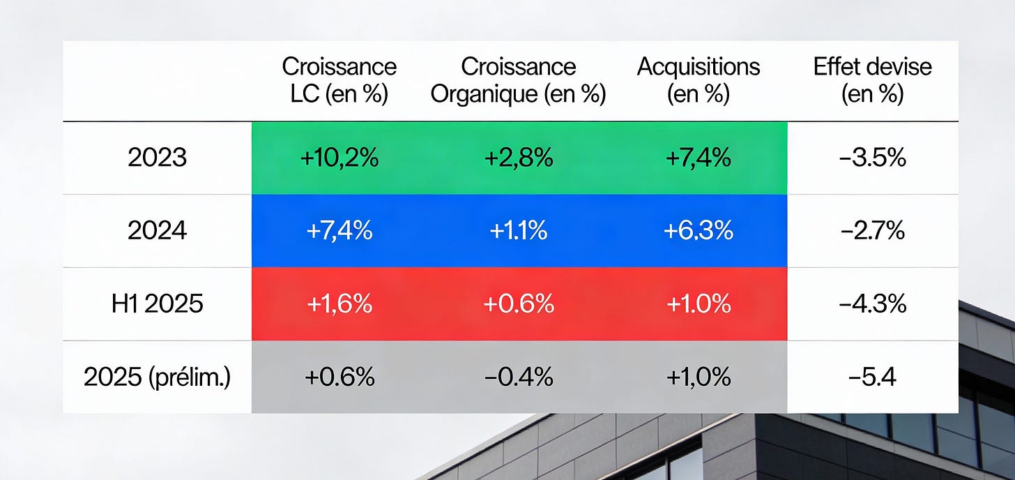Point d’attention majeur : La croissance organique est passée en territoire négatif en 2025 (-0,4%), impactée par la crise du marché chinois de la construction. Hors Chine, la croissance organique aurait été de +1,2%, ce qui reste modeste mais positif. C’est le cœur du débat sur Sika actuellement : l’entreprise traverse-t-elle un simple creux cyclique ou fait-elle face à des défis structurels ?