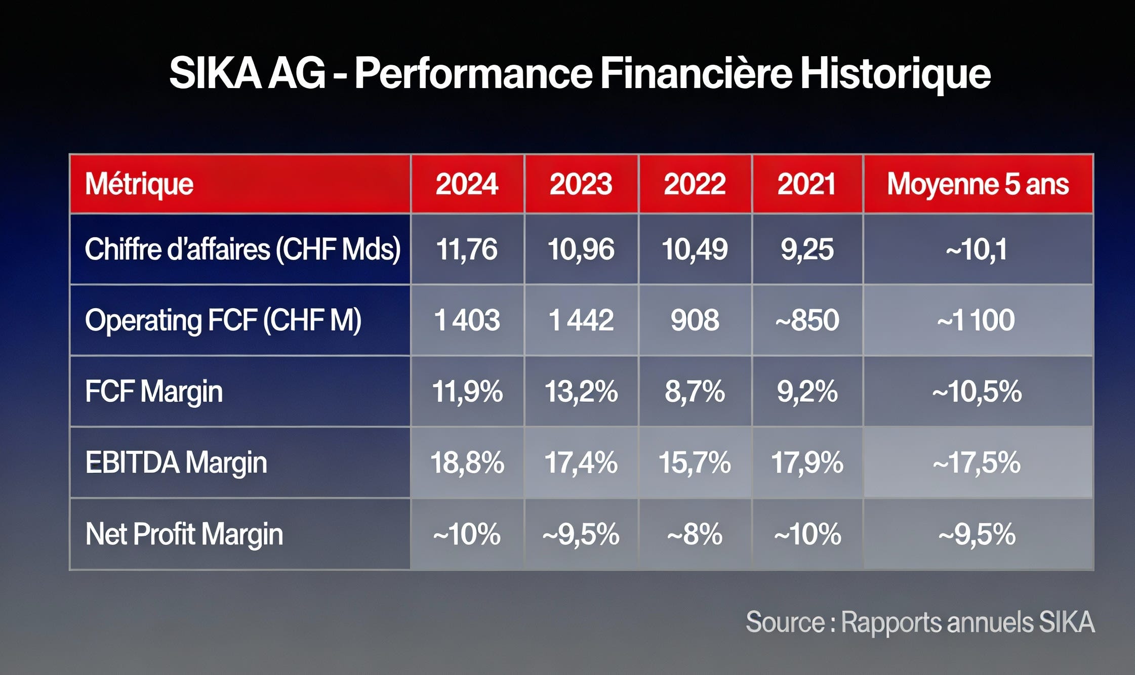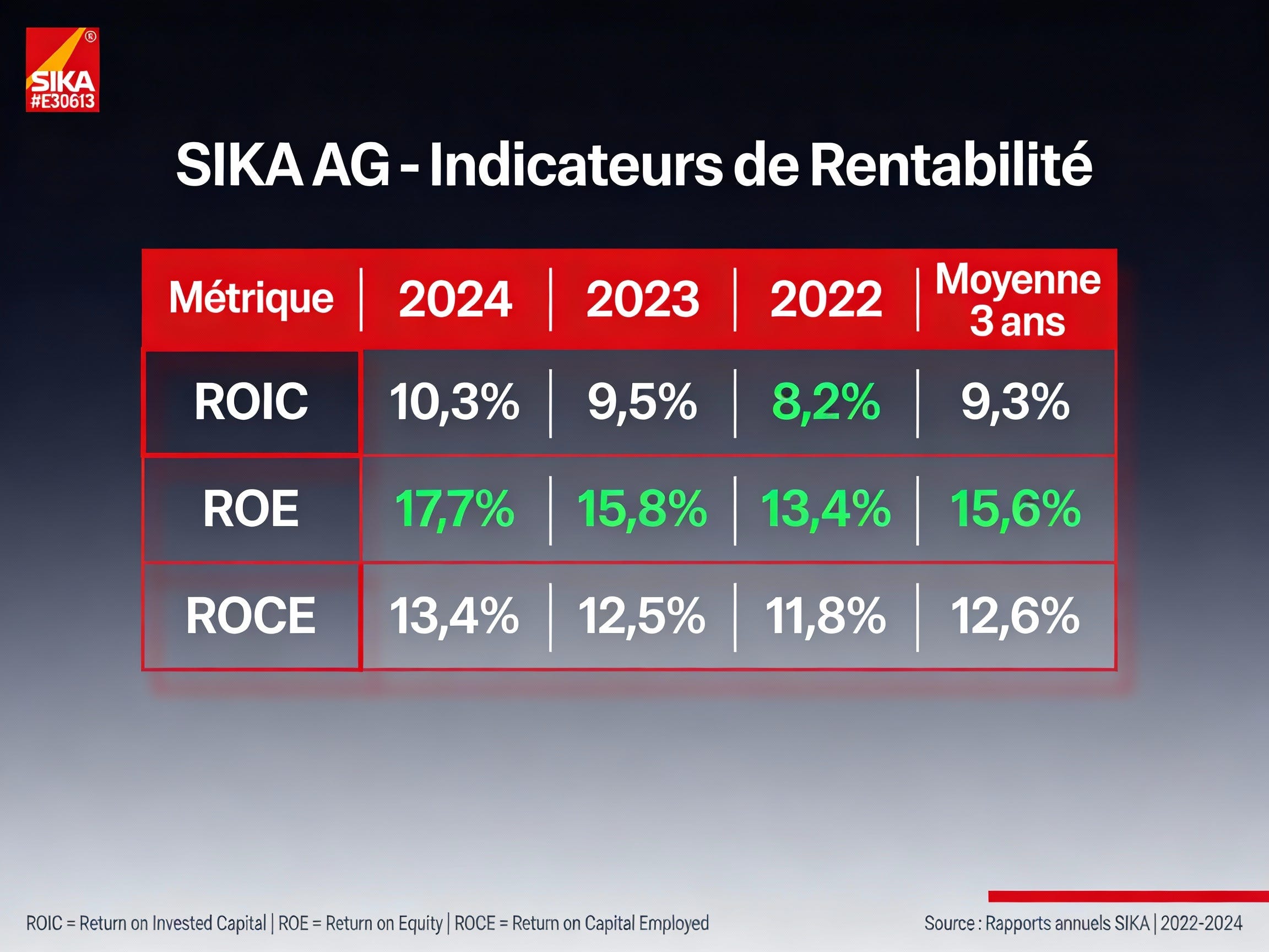 Analyse ROIC : Le ROIC actuel de ~10% est honorable mais inférieur aux niveaux pré-MBCC (~12-14%). L’intégration de MBCC a temporairement dilué les retours sur capital. La vraie question est de savoir si Sika peut ramener son ROIC au-dessus de 12% d’ici 2026-2027 grâce aux synergies de l’acquisition.