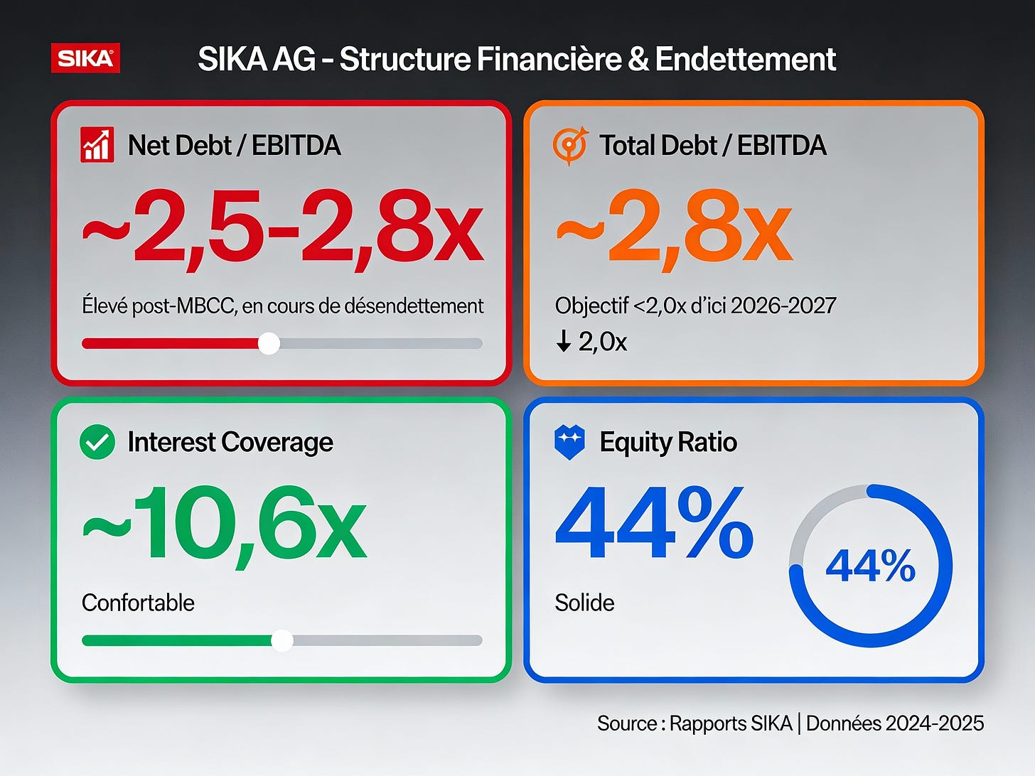 Point positif : La dette est majoritairement à taux fixe, limitant la sensibilité aux hausses de taux. Sika bénéficie d’un rating investment grade et d’un accès favorable aux marchés de capitaux.