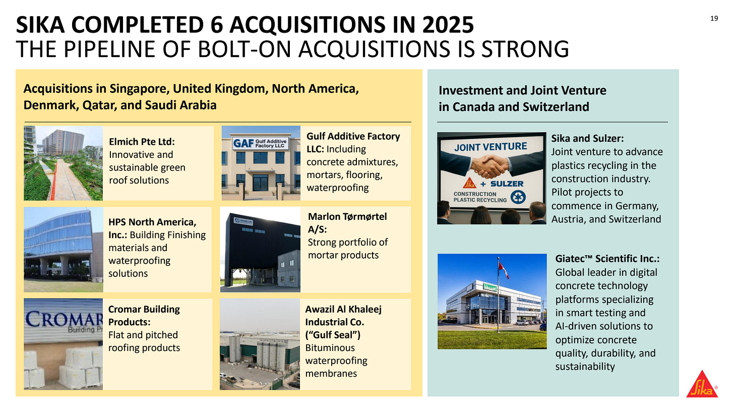 La philosophie d’acquisition de Sika repose sur plusieurs principes structurants. L’entreprise cible des acteurs de niches géographiques ou produits avec des marques fortes. L’intégration est relativement centralisée sur les synergies achats et production. L’objectif est de créer de la valeur via l’expansion géographique des produits acquis et l’accès au réseau de distribution Sika. Historiquement, Sika vise un ROIC incrémental supérieur à 15% sur les acquisitions.