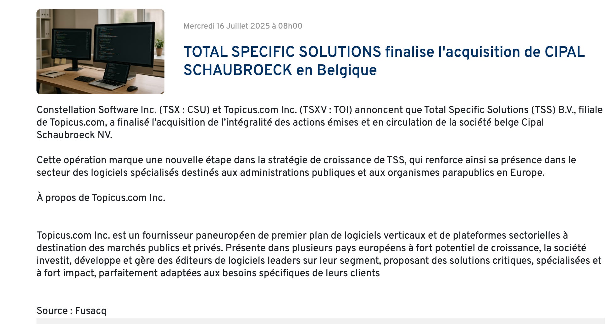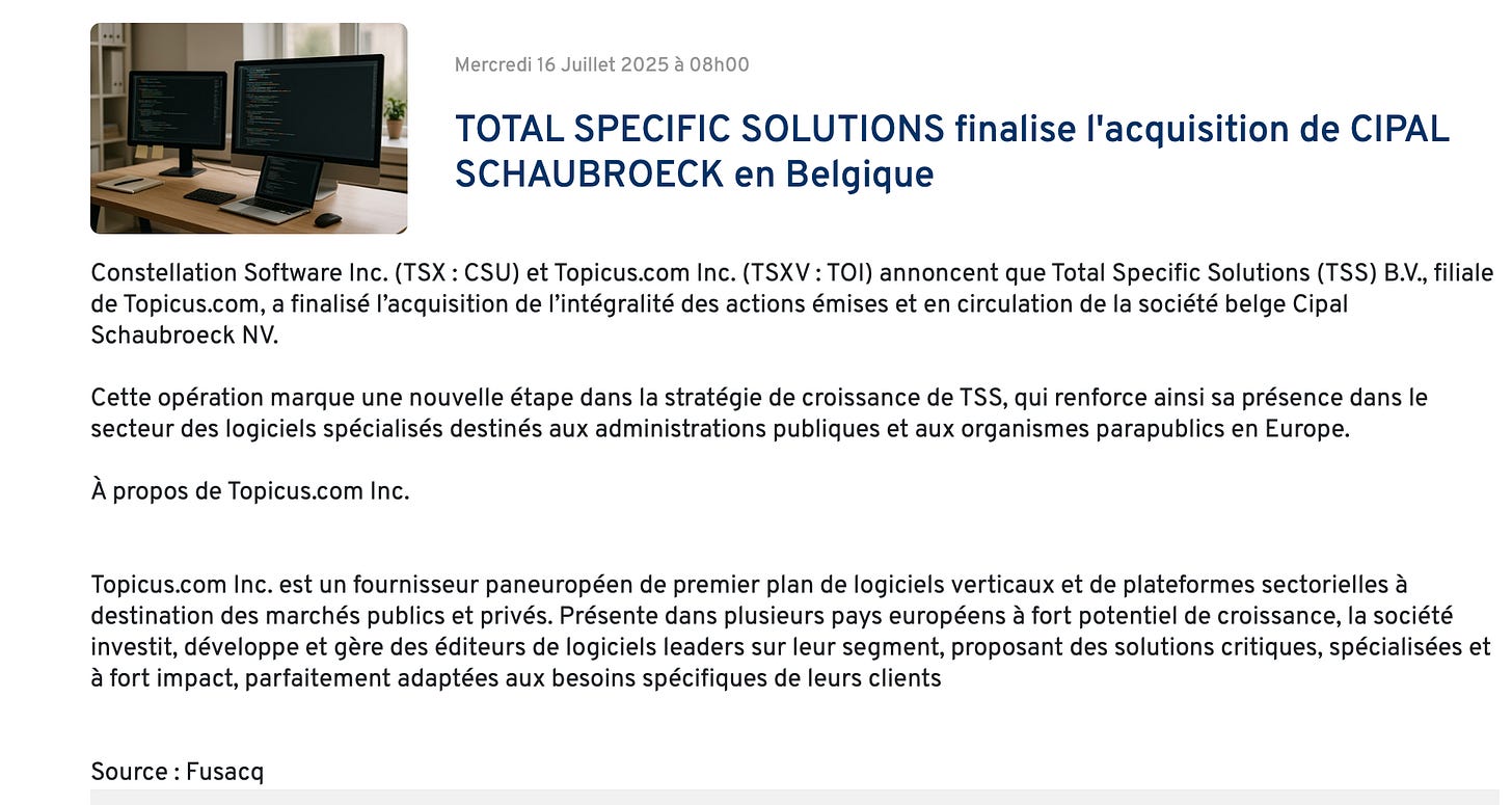 Cipal Schaubroeck (CS) : acquise le 2 juin 2025 pour €223,6 millions, c’est la plus grosse acquisition individuelle jamais réalisée par Topicus.