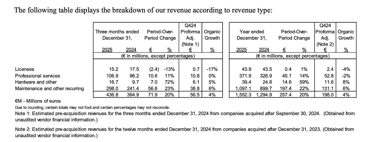 La maintenance génère du revenu récurrent élevé : en 2025, les revenus de “Maintenance and other recurring” ont représenté €1 097 millions sur €1 552 millions de chiffre d’affaires total, soit 70,7% du revenu total.