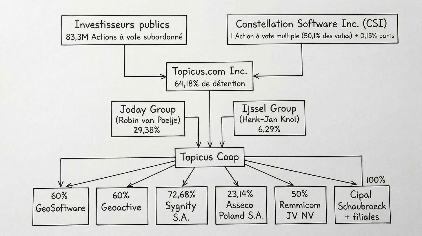 Actionnaire de contrôle : Constellation Software Inc. (CSI) — détient la Super Voting Share (50,1% des votes) et 0,15% de l’equity économique via Topicus Coop + la participation CSI globale d’environ 30,35% sur base diluée