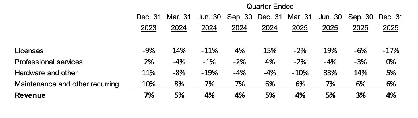 La ventilation entre croissance organique (4%) et croissance par acquisition (16%) est explicitement fournie chaque trimestre et pour chaque type de revenu. C’est une pratique qui suit les standards Constellation Software, le gold standard de l’industrie.