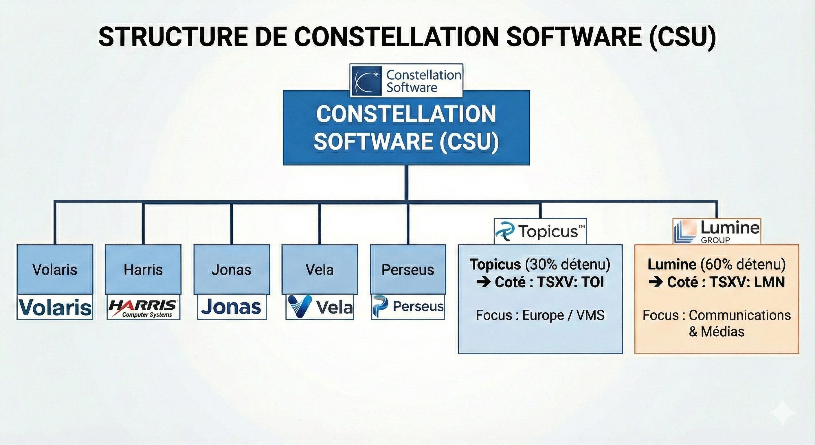 Topicus et Lumine sont des spin-offs de Constellation, focalisées respectivement sur l’Europe (surtout Benelux) et les logiciels de communication/média. Elles suivent le même playbook.