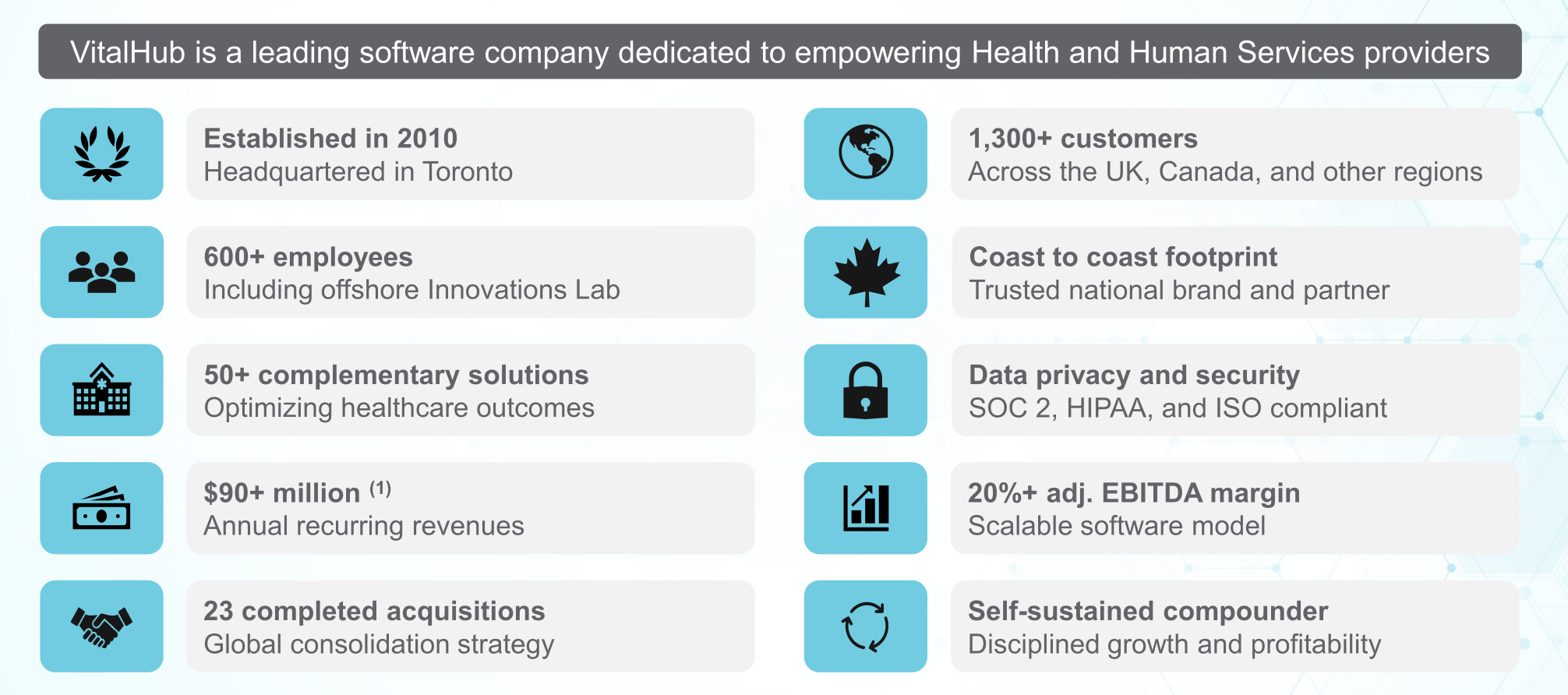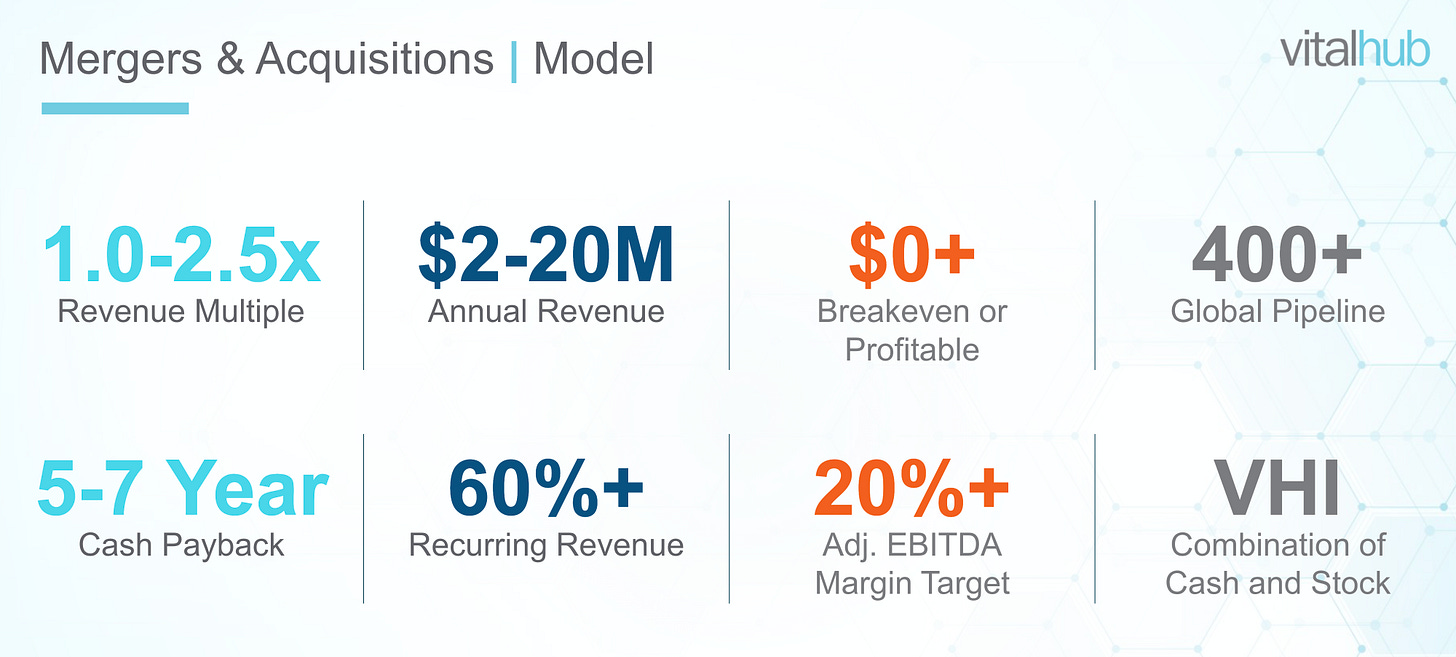 Dans leur présentation investisseurs, VitalHub affiche des critères précis.