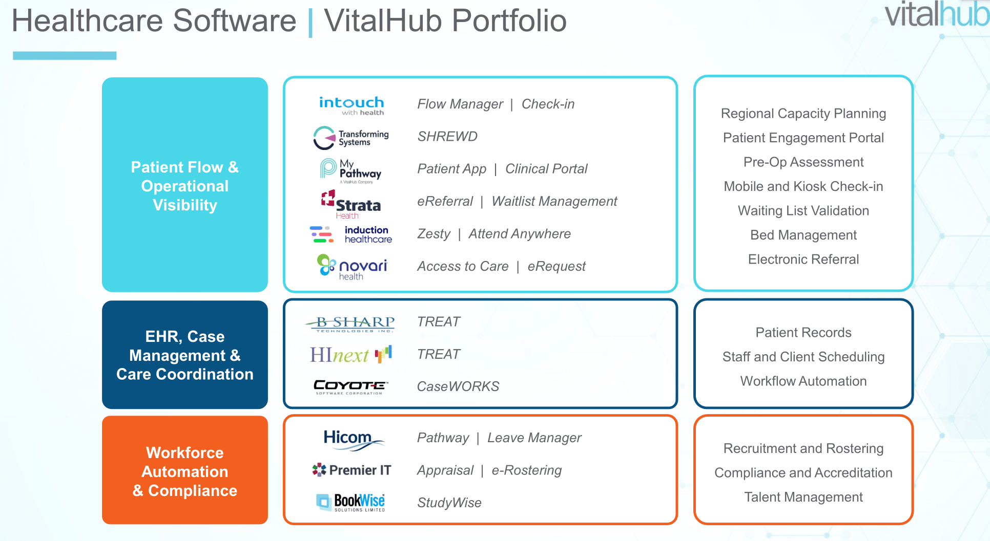 L’“EHR, Case Management & Care Coordination” représente environ 20% et comprend les dossiers patients électroniques pour la santé mentale, les soins de longue durée, et la santé communautaire.