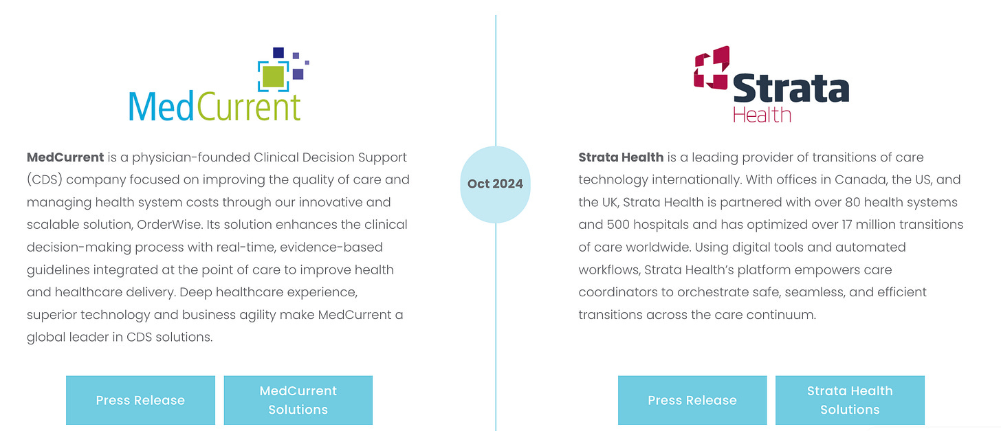 Strata Health et MedCurrent (octobre 2024) : Deux acquisitions simultanées. Les montants exacts ne sont pas entièrement divulgués, mais les documents suggèrent des multiples raisonnables autour de 2x le revenu.